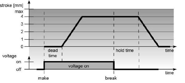 В случае нормально закрытого исполнения клапан плавно открывается движением плунжера при включении рабочего напряжения и по истечении времени паузы. После отключения рабочего напряжения и по истечении времени выдержки клапан равномерно закрывается под действием закрывающей силы пружины сжатия. Закрывающее усилие нажимной пружины согласуется с закрывающим усилием имеющихся в продаже клапанов и удерживает клапан закрытым при отсутствии питания.