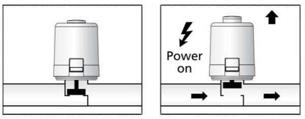 В исполнительном механизме CU-ACT-B230V используется расширительный блок с сопротивлением и пружиной сжатия. Расширительный блок нагревается за счет подачи рабочего напряжения и перемещает встроенный плунжер. Сила, создаваемая этим движением, передается на поршень, открывая или закрывая клапан.